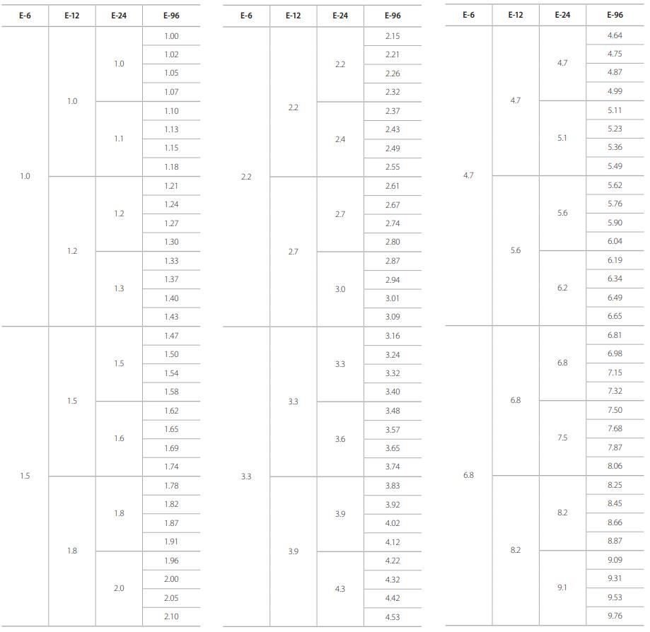 下表列出每種系列的厚聲電阻的標準阻值,表中的阻值是按照通用倍率得出的接近阻值。