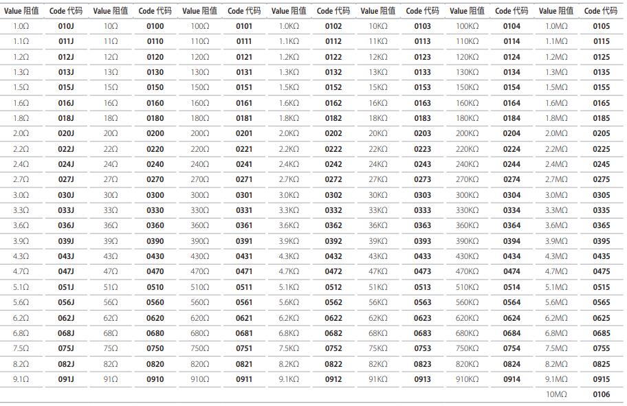 E-24 系列標準厚聲電阻阻值和料號系統(tǒng)使用代碼 ( 4 位 , 以 0 為首位 , 2%、5%、10% 公差 )