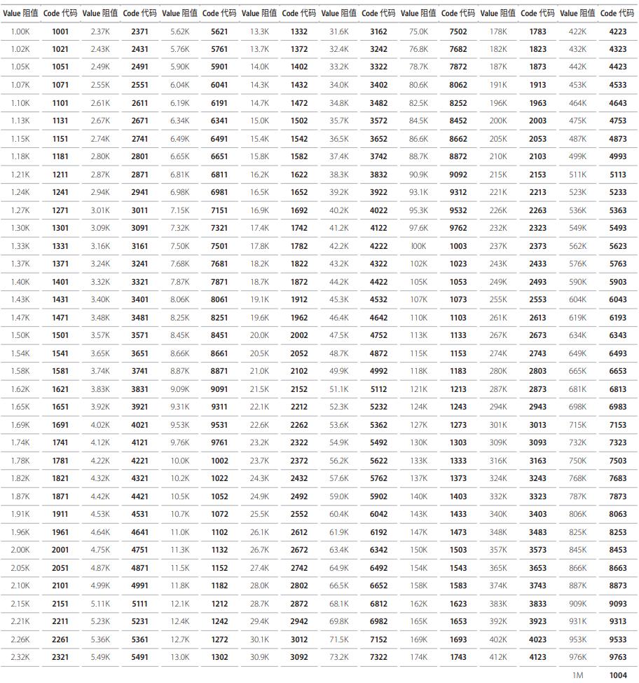 厚聲電阻標準阻值參數(shù)表大全