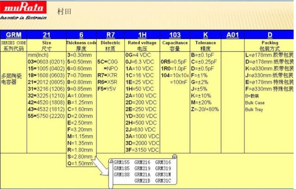 村田電容全系列產(chǎn)品命名規(guī)格和命名對照表